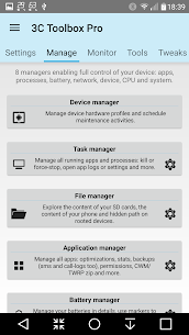 3C Toolbox Pro combina las características de las mejores 100 aplicaciones de pago como Battery Monitor Widget, System Tuner, Titanium Backup, Greenify, BetterBatteryStats, App2SD, Seeder, ROM Toolbox Pro, SetCPU, System Panel, Root Explorer, Autorun Manager, Terminal Emulator, Script Editor, SD Booster, BuildProp Editor, ATK y muchos más para controlar, monitorizar y optimizar los dispositivos Android.